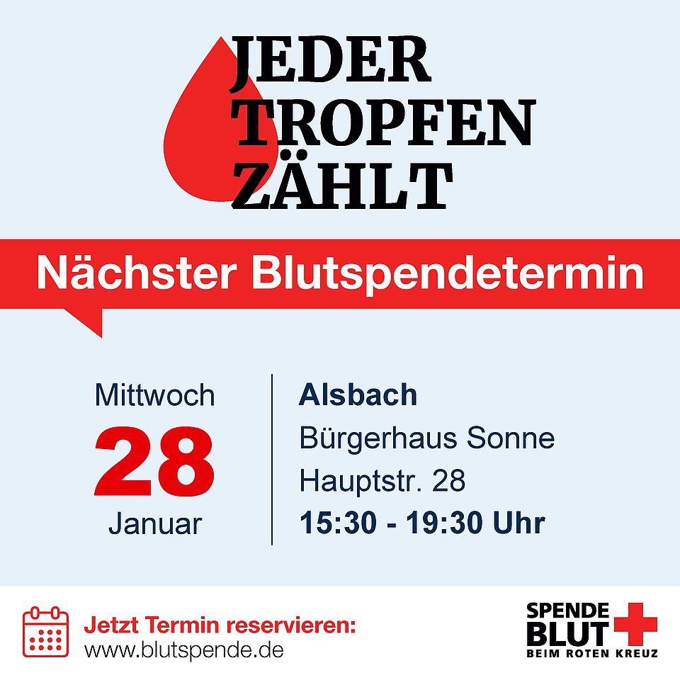 Die nächste Blutspende in Alsbach findet am 28.01.2026 im Bürgerhaus Sonne (Hauptstaße, Ecke "im Klingen" im Ortsteil Alsbach) statt.